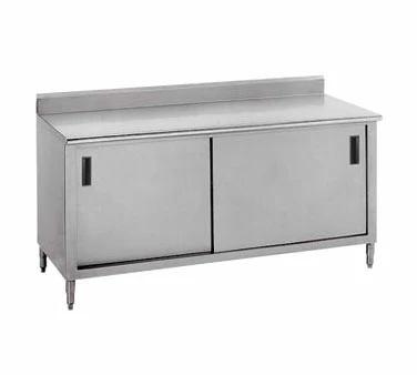 Product Details for Advance Tabco 96″ x 36″ Work Table with Cabinet Base, Sliding Doors, 5″ Backsplash and Midshelf